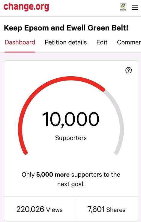 A petition launched against the inclusion of Green Belt sites for housing in Epsom and Ewell Borough Council’s Draft Local Plan has now topped 10,000 signatories, ( as at March 16 ). Believed to be the largest ever petition response to any policy change in the borough, this record petition continues to attract signatures daily.